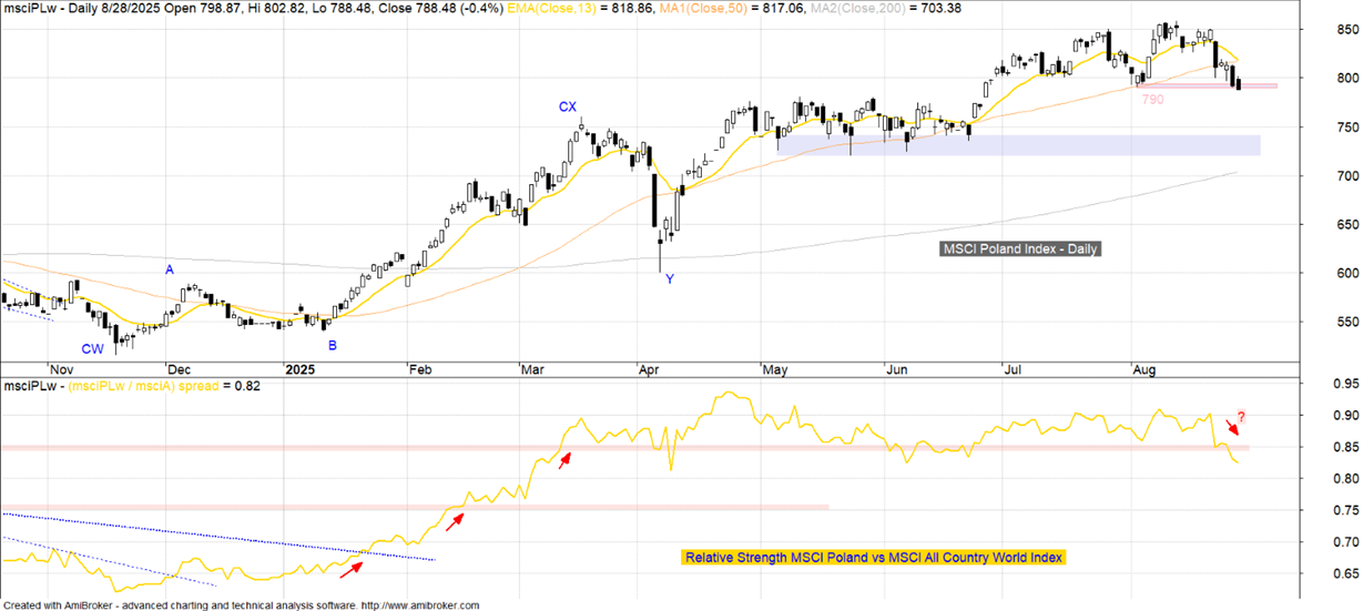 Kluczowy z punktu widzenia inwestorów zagranicznych indeks MSCI Poland od dwóch sesji atakuje letnie wsparcie w postaci dołka 790 pkt z 4 sierpnia. W przypadku braku obrony kolejną strefą wsparcia będzie dopiero obszar serii długich dolnych cieni z okresu maj—czerwiec (720—740 pkt). Negatywnemu rozwiązaniu sprzyja ujawniająca się w ostatnich tygodniach relatywna słabość mierzona relacją MSCI Poland vs MSCI All Country World Index.