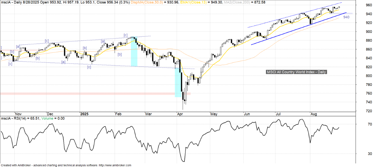 Skupiający ogół światowych rynków rozwiniętych i rozwijających się MSCI All Country World Index lekko poprawił wczoraj dotychczasowy tegoroczny rekord 957 pkt sprzed tygodnia. Choć w perspektywie ostatnich dwóch miesięcy dostrzegalna jest potencjalnie schyłkowa struktura wznoszącego się klina, to o konkretnym sygnale możliwego pogorszenia światowej koniunktury można by było mówić dopiero po spadku poniżej 940 pkt.
