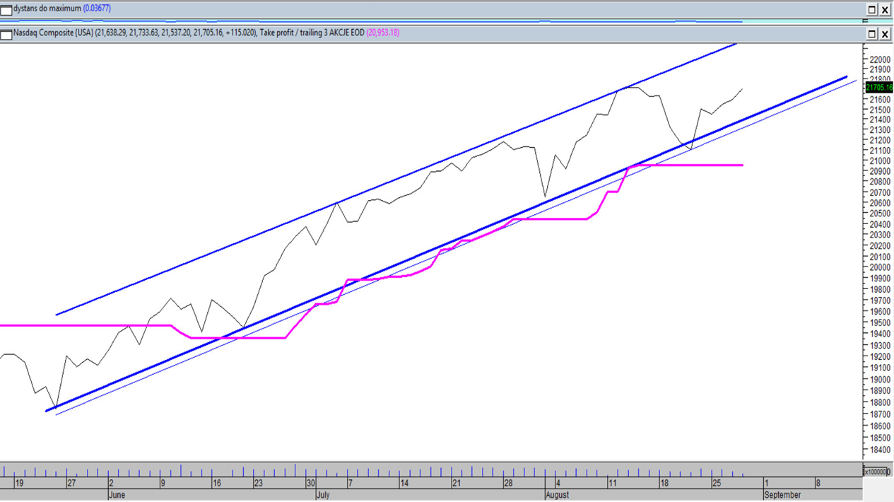 We czwartek szeroki indeks amerykańskich spółek technologicznym podniósł się 0,54%. Wystarczyło to tym razem jedynie do zbliżenia się do historycznych maksimów liczonych na zamknięcie dnia, a ukształtowanych w pierwszej połowie miesiąca na odległość 0,03%. Nowe ekstrema wydają się być kwestią najbliższych sesji. Kurs porusza się w wyraźnym kanale wzrostowym, a do obrony obecnego trendu wystarczy póki co trailing na poziomie 3,5% licząc od kolejnych lokalnych maksimów.