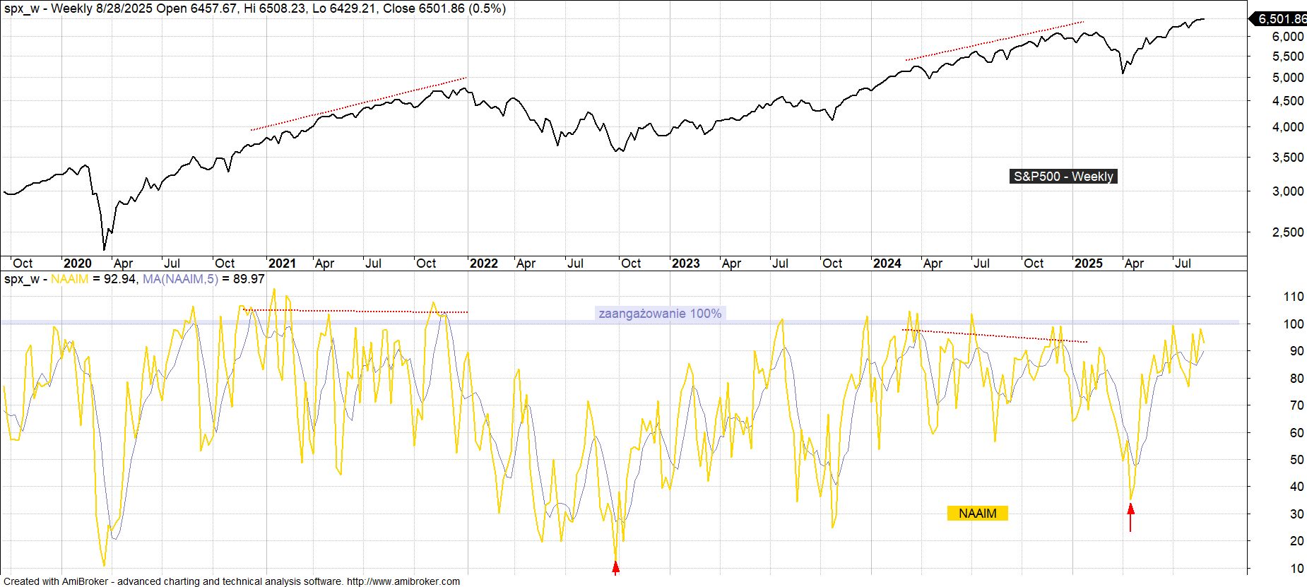 Na koniec cotygodniowego przeglądu amerykańskich wskaźników sentymentu rzut oka na średnie zaangażowanie aktywnych zarządzających prezentowane przez The National Association of Active Investment Managers (NAAIM). Na tle omawianych wcześniej wskazań AAII oraz II widać tu relatywnie największy optymizm, jednak i w tym przypadku w kontekście długoterminowych perspektyw nie pojawiło się nawet wstępne kontrariańskie ostrzeżenie w postaci wzrostu zaangażowania powyżej granicy 100% (bieżący odczyt to 92.9%, maksymalny w bieżącym cyklu 99.3%).