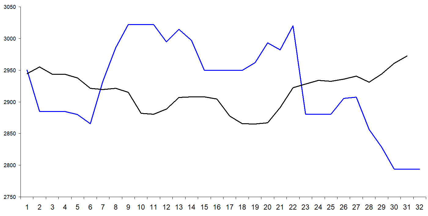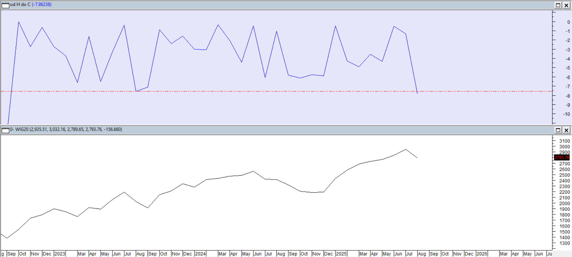Statystyczny sierpień indeksu Wig20 charakteryzuje się wyraźną, ale niezbyt silną tendencją spadkową (kolor czarny od początku miesiąca do mniej więcej 19-tego. Potem w ciągu kolejnej dekady kurs powraca w rejon z 1 sierpnia i statystyczny sierpień wypada na 0. Tym razem Indeks zachował się niezgodnie ze statystyką. Do 20-ego rynek (kolor granatowy) kontrolowały byki. Potem pojawiło się osłabienie i mini-załamanie, w efekcie kurs indeksu Wig20 od swojego maksimum do końca miesiąca zniżkował o 7,86% co jest najgorszym wynikiem od sierpnia 2022 roku.