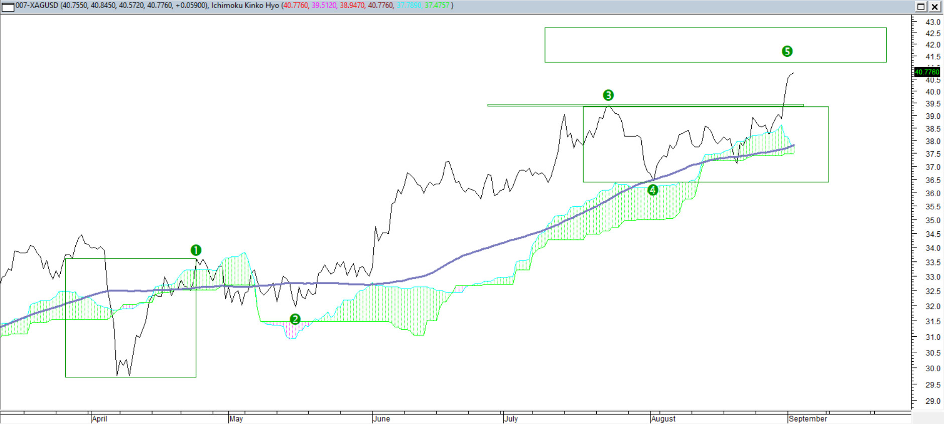 Podczas piątkowej sesji kurs srebra pokonał swoje tegoroczne ekstrema i ty samym znalazł się najwyżej od 2011 roku. Z kwietniowego dna można dostrzec klasyczną wzrostową strukturę impulsową z przejściem w ostatnich dniach do V fali. W tej sekwencji kurs może dotrzeć do co najmniej do strefy 41,18-42,74 USD. Układ średnich dowolnych potwierdza istnienie bardzo silnego trendu wzrostowego, a solidny trend prowadzić może zwykła średnia ze 100 jednostek.