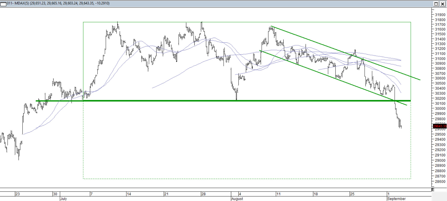 Wtorkowa sesja przyniosła wyraźne osłabienie w segmencie średnich spółek u naszych zachodnich sąsiadów. Kurs indeksu MDAX obniżył się o 2,6%. Wsparcie minimum z 1 sierpnia zostało pokonane dołem. Ta niedogodność mocno zagraża trwaniu średnioterminowego trendu. Ruch poza wspomniane wsparcie może zamienić się w ucieczkę byków do nawet do poziomu 28700 pkt., a zatem o wysokość kształtowanej wakacyjnej konsolidacji.