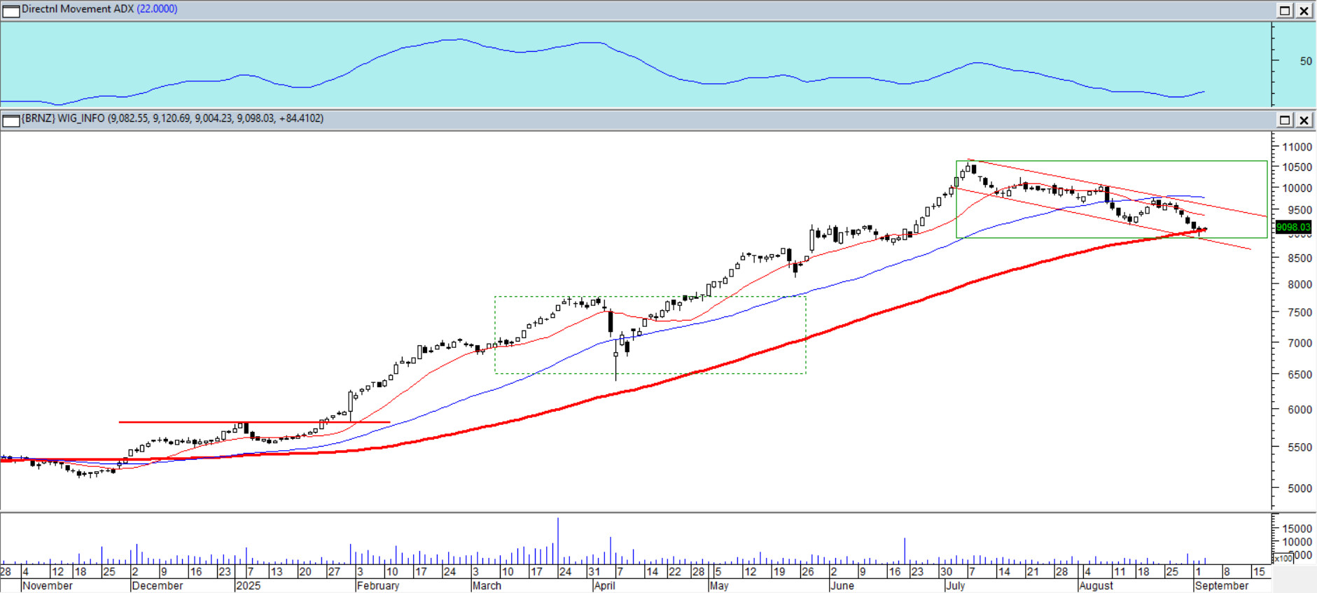 Od listopadowego dołka branżowy indeks informatyczny podniósł się o ponad 100%. Nie dziwi zatem fakt trwającej już od dwóch miesięcy zniżki. Przyjęła ona postać kanału spadkowego pokonując po drodze w dół wszystkie krótkoterminowe średnie. Podczas ostatnie sesji kurs osiadł na średniej ze 100 sesji. Obecny ruch spadkowy nadal nie jest większy w cenie od tego agresywnego spadku w kwietniu. Byków może niepokoi startujący z niskich poziomów, który ADX(14) uniósł się górze sygnalizując utrendowienie w kierunku spadkowym.
