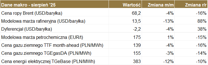 Modelowa marża rafineryjna Orlenu w sierpniu 2025 roku spadła do 13,5 USD z 15,5 USD w lipcu 2025 roku. Dyferencjał jest ujemny i wynosi -2,2 USD, wobec ujemnego dyferencjału w lipcu, który wyniósł -2,3 USD. Modelowa marża rafineryjna spadła w stosunku do lipca, w porównaniu r/r była jednak niemal dwukrotnie wyższa. Marża petrochemiczna nadal utrzymuje się na niskim poziomie. Gaz ziemny potaniał nieznacznie w stosunku do lipca, w ujęciu rocznym spadek wynosi ok. 15%. Tańsza jest również energia elektryczna.
