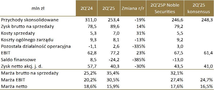 Spadek przychodów r/r wynika z niższej liczbie lokali przekazanych klientom: 392 w 2Q’25 vs 548 w 2Q’24. Poziom przychodów nieznacznie przekroczył jednak nasze i rynkowe szacunki.
