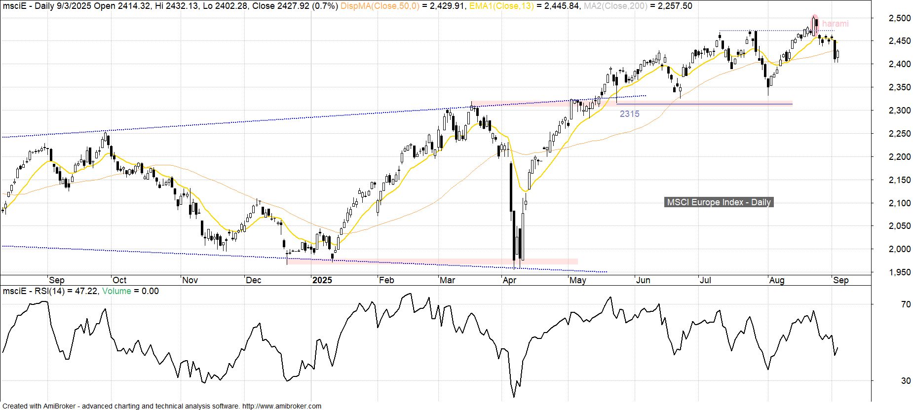 W przypadku skupiającego 15 europejskich rynków rozwiniętych indeksu MSCI Europe wyznaczenie nowego rekordu wszechczasów po ostrej przecenie z pierwszej połowy kwietnia okazało się kwestią niespełna miesiąca, co wypada uznać za duże pozytywne zaskoczenie, z którym wiąże się sygnał wejścia w nową falę hossy po blisko rocznej rozszerzającej się konsolidacji. W tej perspektywie główną linią obrony pozostaje pułap 2 315 pkt, na natomiast na krótką metę możliwość korekty w tym kierunku została zasygnalizowana niedźwiedzią świecową formacją harami z początku ubiegłego tygodnia.
