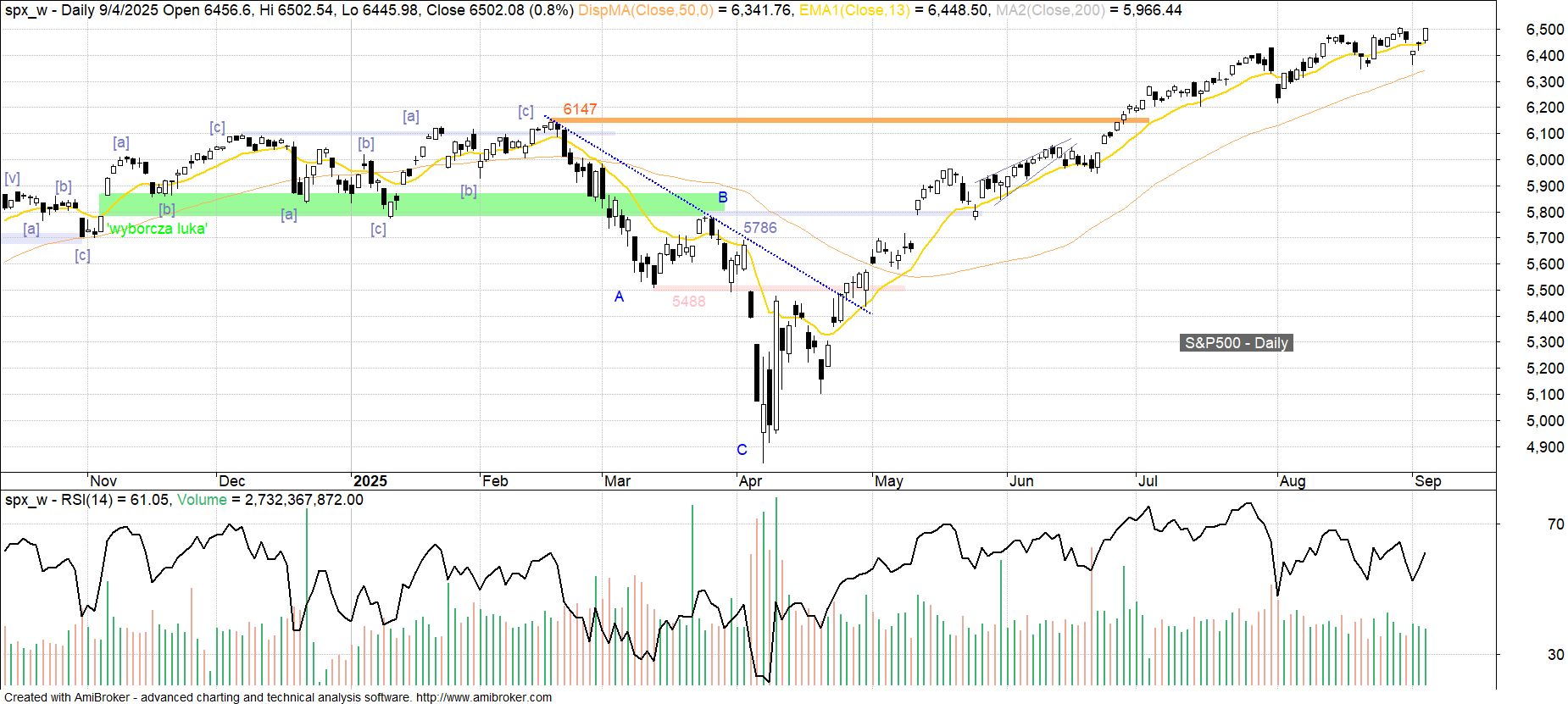 Końcem czerwca S&P500 wybił się ponad dotychczasowy historyczny szczyt 6 147 pkt z połowy lutego, co symbolicznie przypieczętowało wcześniejsze sygnały zamknięcia najbardziej dotkliwego epizodu spadkowej fazy poprzedniego cyklu w formie typowej elliotowskiej struktury korekcyjnej ABC. Z kolei od końca lipca dynamika zwyżki wyraźnie zmalała i niewykluczone, że mamy tu do czynienia z dystrybucją poprzedzającą pierwszą większą korektę w nowej hossie. Na razie nie zmienia tych oczekiwań fakt, iż po wczorajszej zwyżce do kolejnego rekordu jest znowu bardzo blisko (w cenach zamknięcia został już nawet ustanowiony).