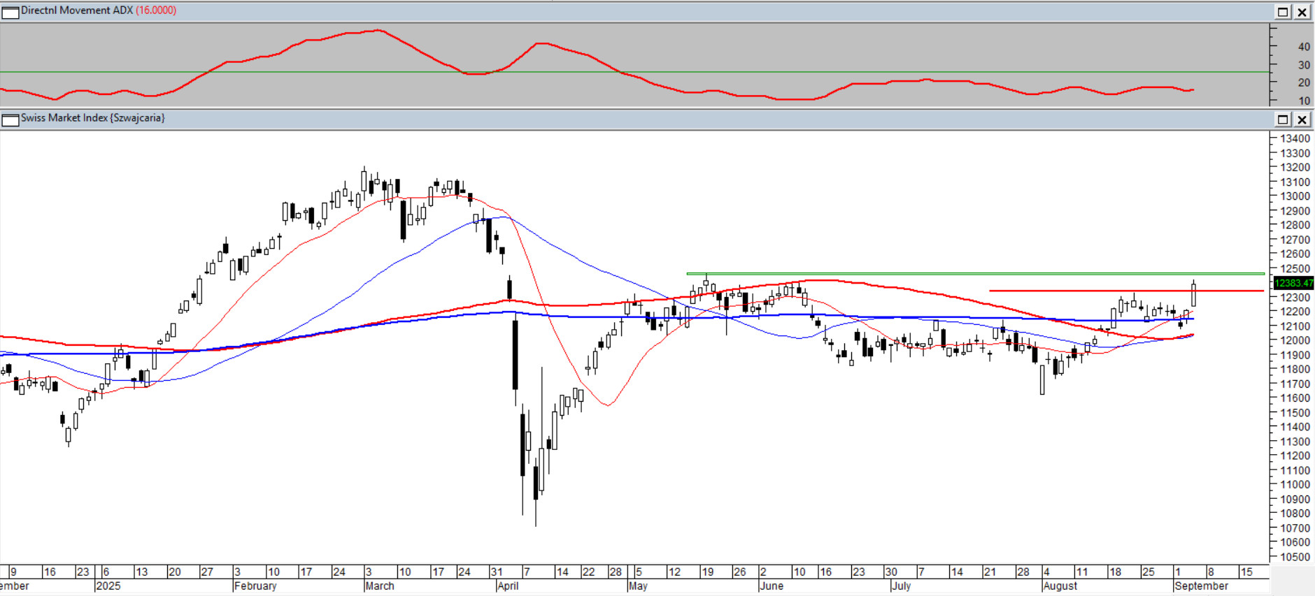 Bardzo ciekawy przebieg miała wczorajsza sesja w Szwajcarii. Najważniejszy indeks tego kraju pokonał swój sierpniowy opór i znalazł się w bezpośredniej bliskości oporu z maja. Jego sforsowanie zapewne otworzyłoby drogę na wyższe poziomy. Dzień ten został okraszony oknem hossy. To może napędzać byki już podczas kolejnych sesji, zwłaszcza, że układ średnich 15/45/100/200 wygląda dla nich niezwykle pomocnie. Kierunkowy ADX(14) już od dłuższego czasu nie wykazuje trendowych skłonności, ale jego niskie poziomy każą być na tę ewentualność przygotowanym.