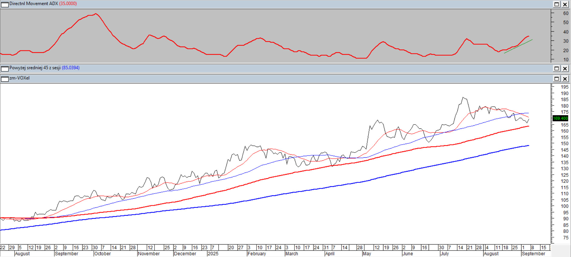 W porównaniu do AmREst, Voxel to walor który znajduje się po drugiej stronie bieguna instrumentów dni sesyjnych w ciągu roku powyżej średniej z 45 sesji. Ten silny trend pozbawiony właściwie głębokich korekt ma aż 85% sesji powyżej średniej z 45 sesji. A największe oddalenie kursu od wspomnianej średniej w dół wynosiło nieco ponad -6%. Co ciekawe kurs poniżej średniej ze 100 sesji przebywał w ciągu ostatniego roku tylko przez 1 dzień. Obecna spadkowa konsolidacja przybiera powoli znamiona zmiany trendu. O tym informuje rosnący od połowy sierpnia wskaźnik ADX(14). Do tego doszło przecięcie średnich 15 i 45 w kierunku spadkowym. Wprawdzie kurs znajduje się poniżej średniej z 45 sesji, ale popularna "setka" dalej trzyma.