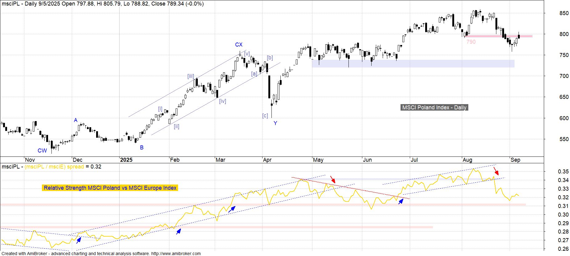 Kluczowy z punktu widzenia inwestorów zagranicznych indeks MSCI Poland wraz z odreagowaniem z drugiej połowy minionego tygodnia próbuje odzyskać wakacyjne wsparcie w postaci dołka 790 pkt z 4 sierpnia. Mimo tymczasowego wyjścia wyżej z sesji piątkowej, próby tej nie można na razie uznać za udaną i nadal najbardziej prawdopodobny wydaje się ruch w kierunku niższego wsparcia 720—740 pkt (obszar kilku długich dolnych cieni z okresu maj—czerwiec). Kontynuacji spadkowej korekty sprzyja ujawniająca się w ostatnich tygodniach relatywna słabość mierzona relacją MSCI Poland vs MSCI Europe Index, przy czym podobna niekorzystna tendencja ma miejsce także względem globalnego indeksu MSCI All Country World Index, jak i segmentu rynków wschodzących (MSCI Emerging Markets Index).
