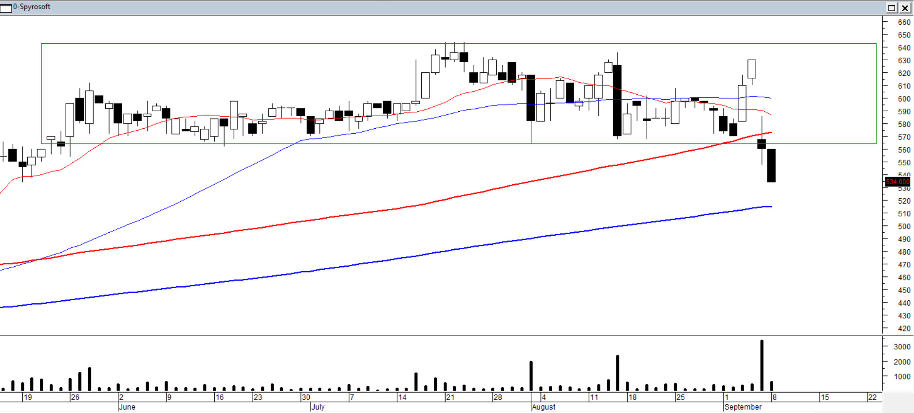 Podczas piątkowej sesji kurs pokonał w dół kilkumiesięczną konsolidację forsując wsparcie okolic 565 zł. Stało się to jednocześnie na wzmożonym (największym w tym roku) wolumenie. W poniedziałek byki podążają piątkowym torem w kierunku zasięgu minimalnego, o wysokość formowanej przez ponad 3 miesiące figury 485,00 zł. Średnia z 200 sesji znajduje się nieopodal i biegnie w okolicach 515,00 zł. Popularna "setka" pierwszy raz od wiosny oporem.