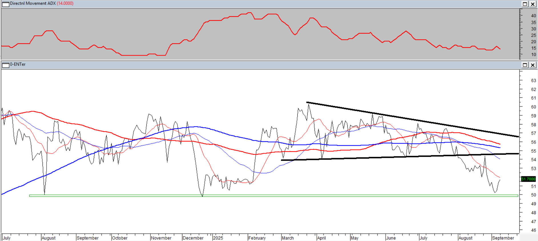 Po sierpniowym opuszczeniu dołem formacji Trójkąta symetrycznego kurs porusza się niebezpiecznie blisko wsparcia rocznych minimów okolic 50 zł. Ich sforsowanie dołem tradycyjnie mogłoby zmotywować podaż do zwiększonej akcji zwłaszcza, że zasięg ruchu o wysokość formowanego trójkąta (48 zł.) nie został jeszcze wykonany. Średnie 15/45/100/200 spełniają rolę oporu i ułożone są w sposób typowy dla trendu spadkowego. ADX(14) konsoliduje się na stosunkowo niskim i poziomie powoli przygotowuje się jest do nowego utrendowienia.