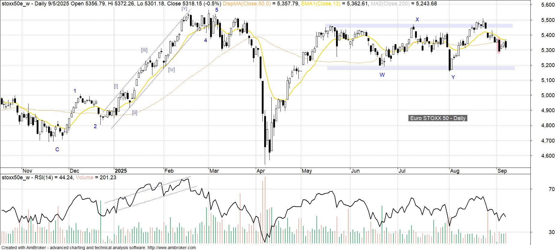 Indeks blue-chipów strefy euro mimo ożywienia z drugiej połowy minionego tygodnia pozostaje w cieniu niedźwiedziego długiego czarnego korpusu z ostatniego wtorku. Do jego negacji potrzebne byłoby wyjście powyżej 5.37 tys. pkt, a dopóki to nie nastąpi w dłuższej perspektywie należałoby przyjąć, iż trwający od maja płaski podwójny zygzak WXY zostanie przedłużony do zygzaka potrójnego z możliwością zejścia poniżej 5.20 tys. pkt.