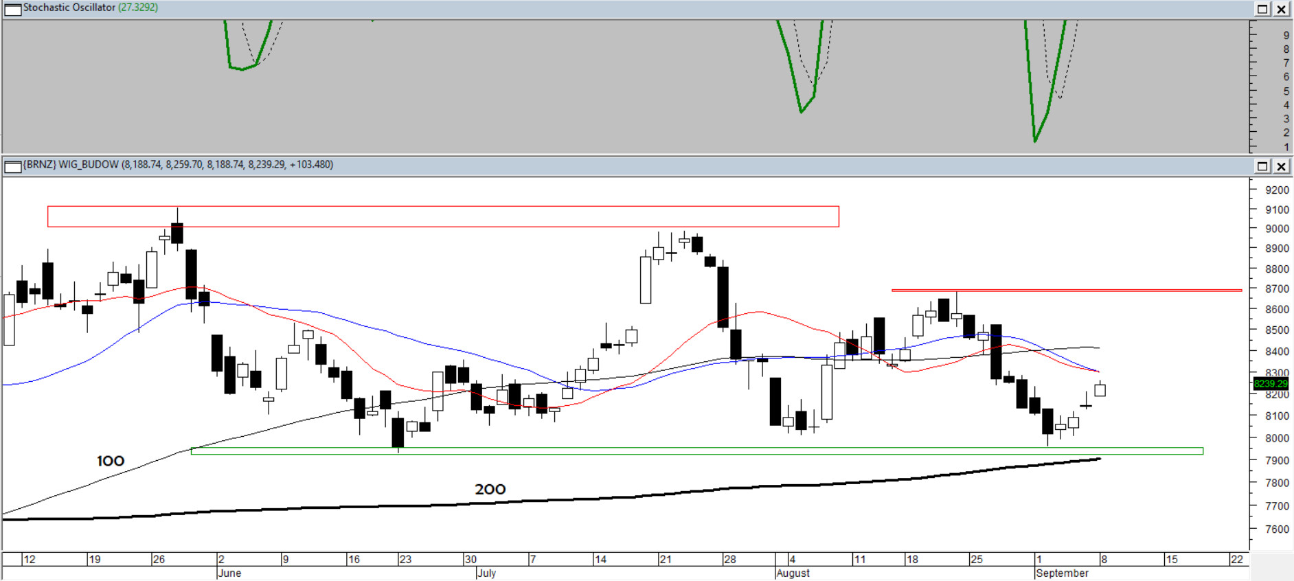 Ostatnie sesje przynoszą uspokojenie w obozie byków. Kurs obronił wsparcie rejonu 8000 pkt. uformowanego podczas czerwcowych i sierpniowych dołków i powoli się oddala. Wystarczyło w tym wypadku dość silne wyprzedanie oscylatorów szybkich, by tempo kształtowych zmian straciło podażowy rezon. Kurs porusza się pod splotem średnich 15/45 stanowiących pierwszą podażową barierę. Potem nieco wyżej jest sierpniowy opór. Krótkoterminowo byki wprawdzie powoli wracają do gry, ale sytuacja jest na tyle niejednoznaczna, że nowe byki mogą w tej strefie nie dostrzegać potencjału do bardziej efektownej zwyżki.