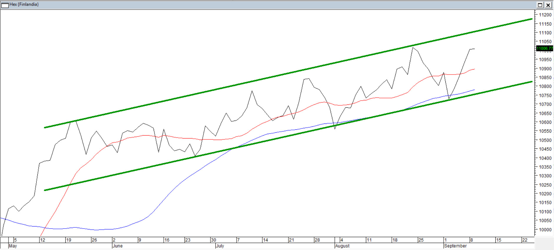 ... najważniejszy indeks giełdowy Finlandii zdecydowanie relatywnie lepiej spisuje się niż nasz rodzimy Wig20. Ostatnie dni przynoszą powrót do głównego trendu po krótkiej korekcie. Kurs porusza się od maja w wyraźnym kanale wzrostowym. Układ średnich krótkoterminowych jest korzystny dla rynku byka i stanowi dodatkową "barierę" dla nacierającej podaży w okolicach dolnego ograniczenia wspomnianego kanału.