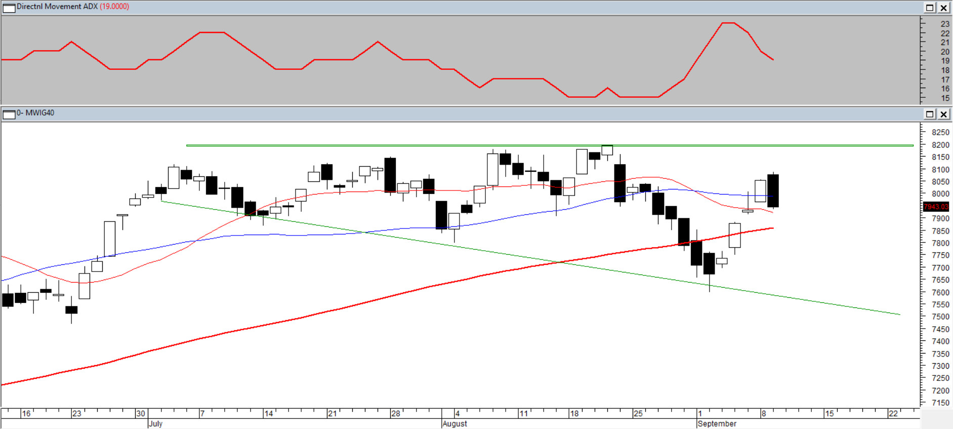 Konsolidacja, której start datuje się wraz z początkiem wakacji przyjęła postać trójkąta rozszerzającego. Układ, którego zasadniczą cechą jest wzrost zmienności w jego końcowej fazie. Od drugiej połowy sierpnia kurs odpada w dół co przy jednoczesnym wzroście wskaźnika ADX(14) jest typową sygnalizacją utrendowienia w kierunku spadkowym. Wczorajsza sesja przynosi formację spadkową "Objęcia Bessy". Średnie 15/45/100 tworzą strefę walki 7859-7990 pkt. i potwierdzają niepewność inwestorów, a ich odczyt uzależniony jest w tej chwili od pojedynczych, kolejnych sesji.