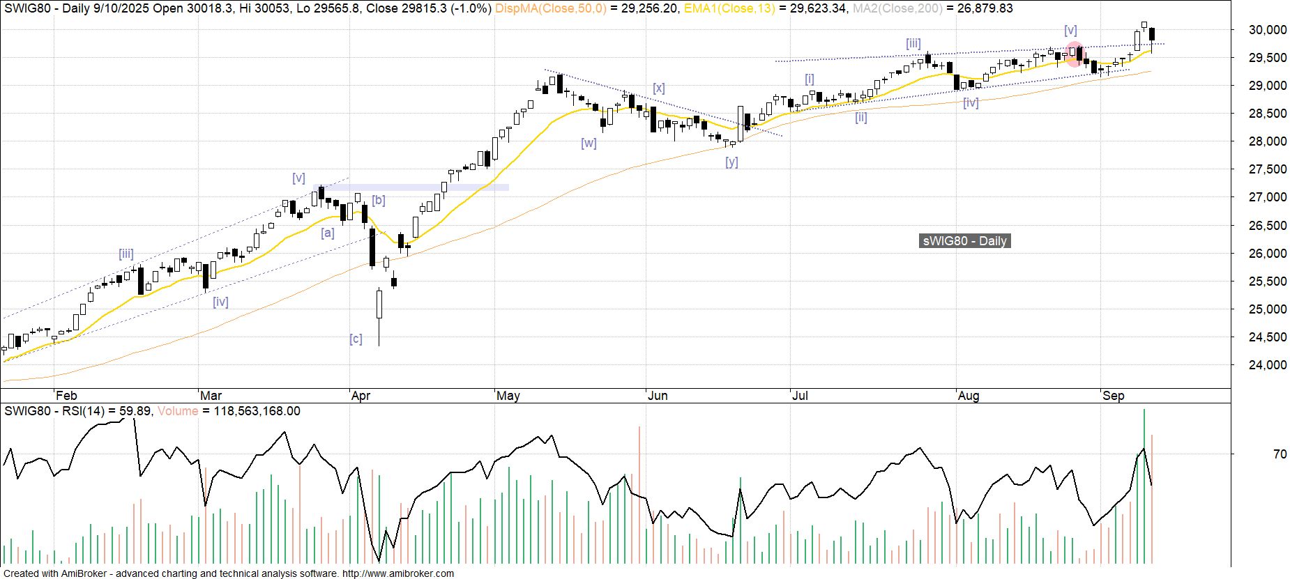 Wczorajsza sesja przyniosła głębokie cofnięcie po mającym miejsce początkiem tygodnia wybiciu górą z około 3-miesięcznego wznoszącego się klina. Ten byczy sygnał ostatecznie został obroniony, jednak aby można było mówić o jednoznacznym utrzymaniu pozytywnych oczekiwań dla rynku małych spółek sWIG80 nie powinien już wchodzić w strefę dolnego cienia ostatniej dziennej świecy (czyli poniżej 29.8 tys. pkt).