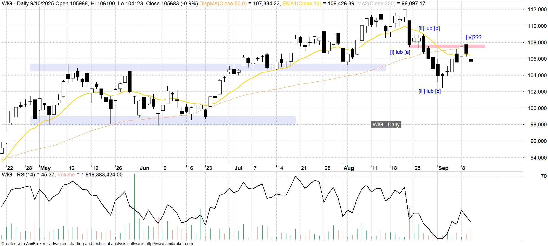 Odreagowanie w górę z pierwszej dekady września nieznacznie wykroczyło ponad przełamane wcześniej lokalne minimum 107.3 tys. pkt z 22 sierpnia, które do tej pory dość jednoznacznie kojarzyło się z dnem fali [i] w domniemanym 5-falowym impulsie spadkowym zapoczątkowanym w tegorocznym szczycie 112.0 tys. pkt. Takie naruszenie pozwala powrócić do alternatywnego wariantu zakończonego już spadkowego zygzaka [a][b][c] (w miejsce początkowych fal [i][ii][iii] w impulsie) i traktować go jako równoważny. W dalszej perspektywie, wobec relatywnej słabości z ostatnich tygodni (ujawniającej się w relacji indeksów MSCI nawet względem najsłabszej pośród głównych rynków bazowych Europy) potencjalnie zakończony zygzak [a][b][c] wygląda bardziej na pierwszy etap płaskiej struktury korekcyjnej 3-3-5, niż na przerywnik przed atakiem na wspomniany wcześniej sierpniowy szczyt. Kolejna spadkowa odsłona takiej struktury byłaby zapewne skorelowana z bezpośrednimi sygnałami przejścia do korekty także w przypadku pozostałej części rynków bazowych (na razie o takich sygnałach można mówić tylko w przypadku Europy).