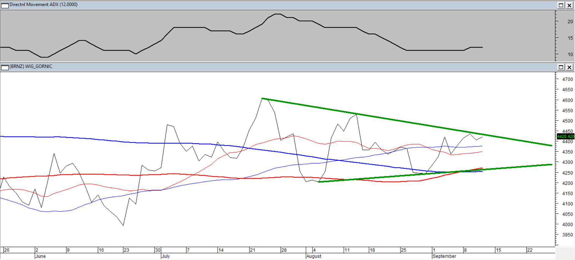 Formowany trójkąt symetryczny na wykresie branżowego „górnika” stwarza szansę także bykom. Szansę na wybicie wzrosła z uwagi na to, że kurs porusza się nieopodal górnego ograniczenia kształtowanej figury. Również sekwencja średnich 15/45/100/200 wydaje się tu być pomocna popytowi. Tworzą one dodatkową strefę wsparcia 4252-4376 pkt. Kierunkowy ADX(14) znajduje się na względnie niskim pułapie 12 pkt. z gotowością do przyszłego utrendowienia.