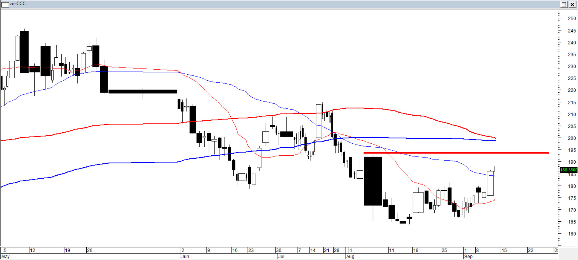 Kurs od miesiąca radzi sobie słabo z oporem dużego wolumenowego korpusu jaki pojawił się na wykresie 8 sierpnia. Ruch z dołka przyjmuje postać korygującej trójki, a to może raczej zniechęcać niż zachęcać do trendowego nabycia. Aby byki czuły się nieco bezpieczniej, kurs powinien powrócić ponad opór maksimum uformowanej wspomnianego dnia świecy czyli pokonać 194 zł. w górę. Średnie ze 100 i 200 sesji ułożone są powyżej omawianej strefy czyli działają na popyt raczej deprymująco. Reasumując, nie pozostaje nic tylko czekać.