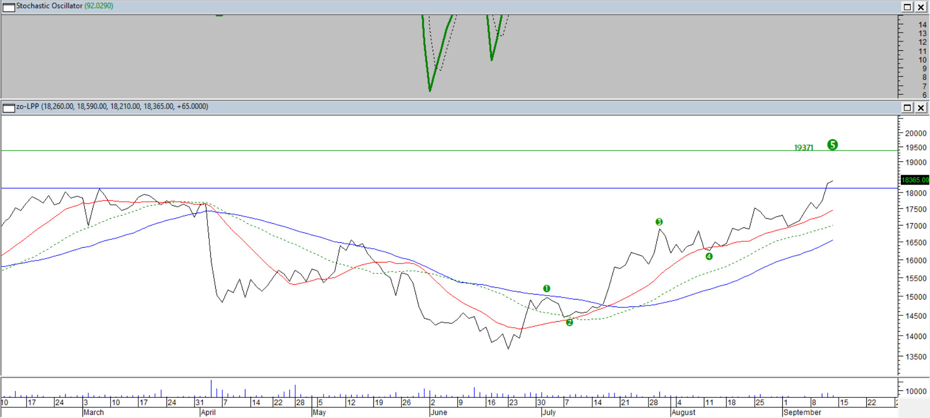 Ostatnie dni przynoszą kolejne radości fanom tej odzieżowej spółki. Kurs wczoraj pokonał historyczne maksima z wiosny i odważnym krokiem zmierza na wyższe poziomy. Małym problemem może być przyszły tydzień (zamykanie serii kontraktów). Jednak z perspektywy fal ruch od czerwcowego dołka jest uformowany w klasyczny impuls, a minimalny zasięg tego ruchu falowego wskazuje, że kurs powinien przekroczyć 19300 zł. Bykom podają rękę prawidłowe ułożone krótkoterminowe średnie 15/30/45, a wskazania szybkich oscylatorów jeszcze nie wykazują typowego dla tak długiego ruchu w górę solidnego wykupienia. Ostrożności nigdy dosyć, wszak kurs porusza się już w piątej, rozszerzonej fali.