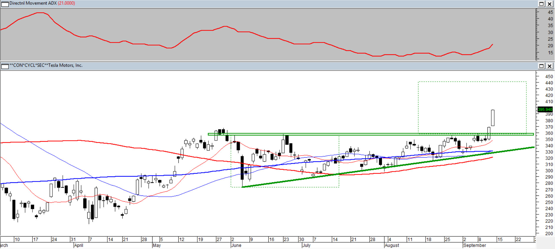 Miniony tydzień przyniósł wybicie kursu ponad tworzony przez ostatni kwartał trójkąt zwyżkujący. Wybicie miało miejsce na podniesionym wolumenie. To może świadczyć o dobrych intencjach byków. Tradycyjnie taki ruch daje szansę kontynuacji co najmniej o wysokość formowanego trójkąta, a zatem do 440 USD. Średnie 15/45/100/200 ułożone są w sposób typowy dla rozpoczynającego się trendu wzrostowego, a ADX(14) rośnie z powyżej 20 pkt. inicjując wejście w nowy trend.