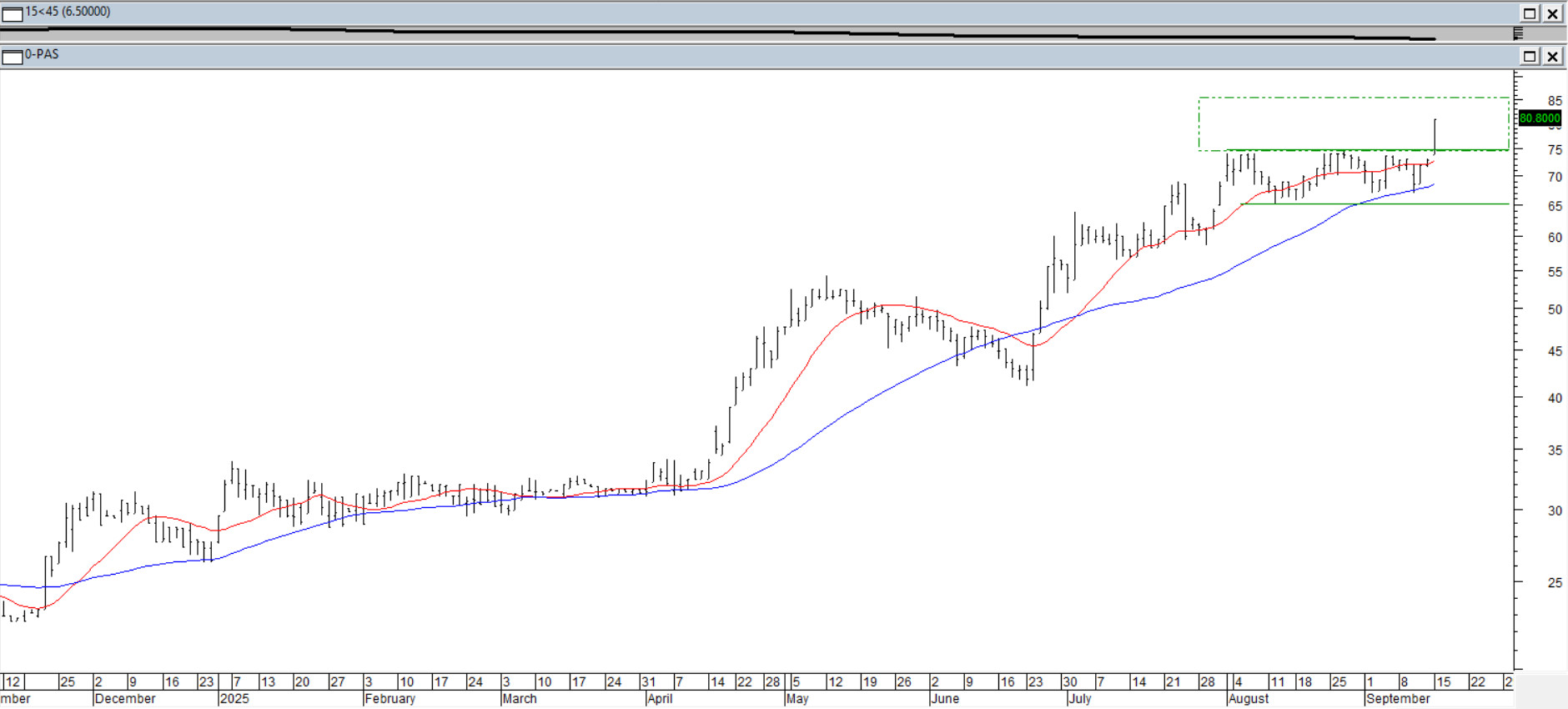 W dniu dzisiejszym kurs wybija z konsolidacji zapoczątkowanej w pierwszych dnia sierpnia. Standardowe wybicie o jej wysokość wskazuje na minimalny zasięgu ruchu w okolice 86,00 zł. Tygodniowe oscylatory znajdują się już w strefie ekstremalnego wykupienia. Układ średnich 15/45 ułożony jest byczo i typowy dla klasycznego trendu wzrostowego. Warto dodać, że w ciągu ostatnich 200 sesji średnia z 15 sesji przebywała pod średnią z SK-45 jedynie przez 6,5% tego czasu, co stawia instrument na przysłowiowym pudle wśród mocarzy notowanym na GPW.