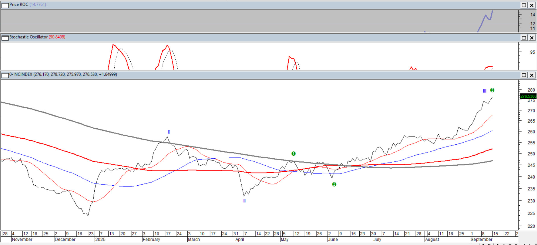 W końcu przedstawiciele spółek notowanych na rynku NewConnect doczekali się swojej hossy. Indeks rośnie praktycznie bez istotnych korekt, co każe przypuszczać, że znalazł się on w klasycznej elliottowskiej III fali i to w jej najdynamiczniejszej części, środkowej 3 podfali. Zdecydowanie za wysoko jest już uformowany (bardzo silny trend) ADX(14) oraz mocno wykupione oscylatory szybkie i wolne. Pamiętać jednak należy, że w tego typu falach to jednak bardzo częste konfiguracje łamiące zasady nie kończące trendu. Niemniej warto mieć na uwadze lekkie ostrzeżenie, stopę zwrotu z 80 sesji (średni termin). Osiąga ona poziomy porównywalne do tych najlepszych z ostatnich 5-ciu lat, zwłaszcza z początku 2023 roku, kiedy to doszło do powolnego wyczerpania potencjału wzrostowego.