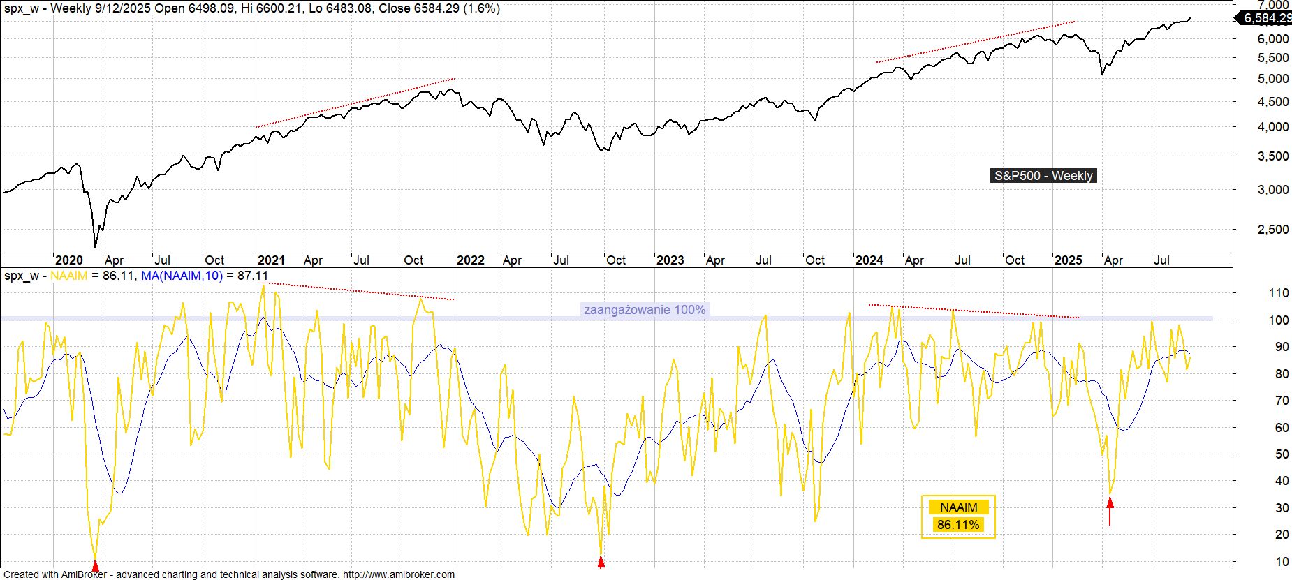 Obliczane przez The National Association of Active Investment Managers (NAAIM) średnie zaangażowanie aktywnych zarządzających w ostatnim tygodniu wzrosło z 81.6% do 86.1%. Na tle innych wskaźników sentymentu (AAII, Investors Intelligence) w ostatnim czasie dostrzegalny był tu relatywnie największy optymizm, jednak i w tym przypadku w kontekście długoterminowych perspektyw nie pojawiło się nawet wstępne kontrariańskie ostrzeżenie w postaci wzrostu zaangażowania na rynku akcji powyżej granicy 100% (maksymalny odczyt w bieżącym cyklu to 99.3%).