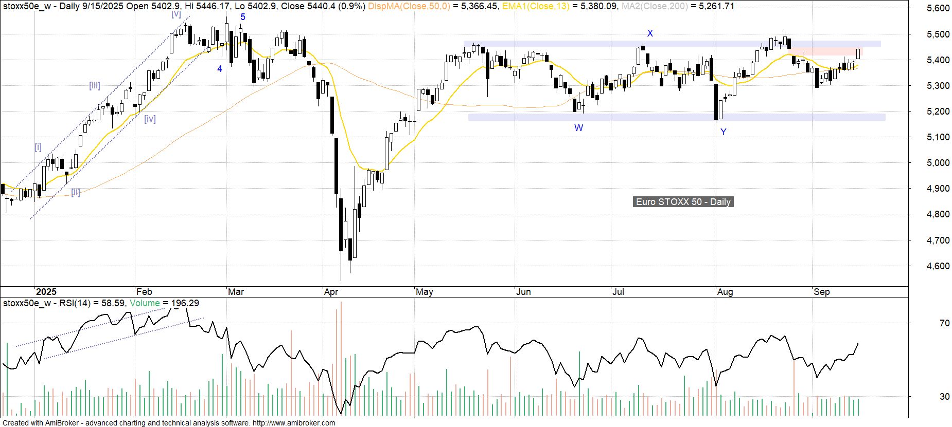 Indeks 50-ciu blue-chipów strefy euro zamknął wczoraj lukę bessy 5 413 – 5 441 pkt, jaka powstała bezpośrednio po nieudanej sierpniowej próbie wybicia górą z trwającego od maja trendu bocznego. Można to traktować jako zapowiedź kolejnej próby wybicia, przy czym zauważalna od dłuższego czasu relatywna słabość Europy zarówno wobec rynku amerykańskiego, jak i segmentu EM na dzień dzisiejszy nie faworyzuje pozytywnego rozwiązania.
