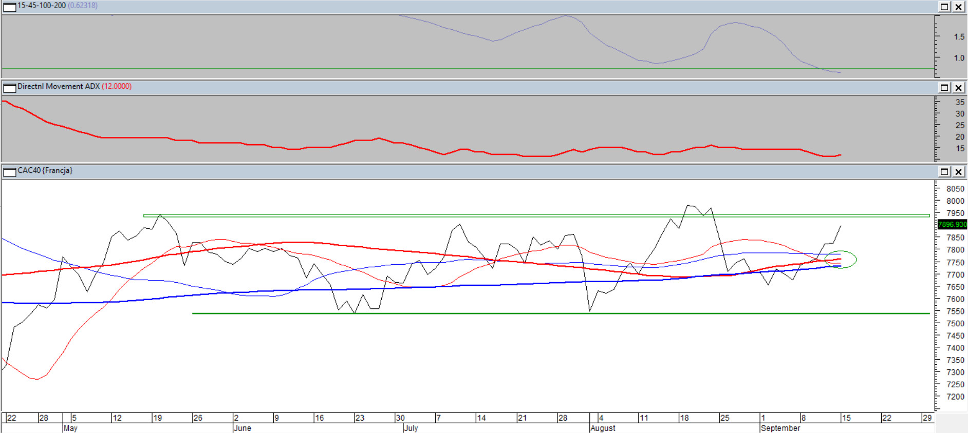Od maja kurs najpopularniejszego indeksu z Francji porusza się w klasycznym ruch bocznym. Każdy kolejny tydzień powinien jednak pokazywać nie tylko gotowość do dynamizowania, ale także kierunek. Na razie jednak pozostaje ruch w bok, dla trendowców, dodajmy, jest to niezbyt frapujący okres. ADX(14) już jest przygotowany do nowego trendu porusza się w strefie niskich wartości, a średnie 15/45/100 i 200 ścisnęły się szerokość 0,6% niespotykaną na tym instrumencie od 2018. Wtedy doszło do znaczącego ruchu, zapewne teraz także stanie się podobnie.