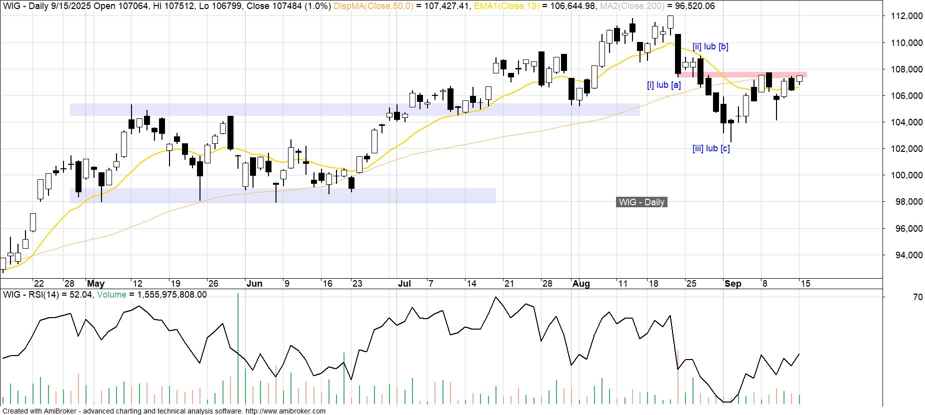 Wrześniowe odreagowanie w górę przed tygodniem nieznacznie wykroczyło ponad przełamane wcześniej lokalne minimum 107.3 tys. pkt z 22 sierpnia, które do tamtej pory dość jednoznacznie kojarzyło się z dnem fali [i] w domniemanym 5-falowym impulsie spadkowym zapoczątkowanym w tegorocznym szczycie 112.0 tys. pkt. Takie naruszenie pozwala powrócić do alternatywnego wariantu zakończonego już spadkowego zygzaka [a][b][c] (w miejsce początkowych fal [i][ii][iii] w impulsie), choć wobec wyraźnie zauważalnej relatywnej słabości (relacja MSCI Poland vs MSCI Europe Index), należałoby go traktować raczej jako pierwszy etap płaskiej struktury korekcyjnej 3-3-5, niż jako przerywnik przed atakiem na wspomniany wcześniej sierpniowy szczyt. Kolejna spadkowa odsłona w takiej strukturze byłaby zapewne skorelowana z bezpośrednimi sygnałami przejścia do korekty także w przypadku pozostałej części rynków bazowych (na razie o takich sygnałach można wstępnie mówić tylko w przypadku Europy).