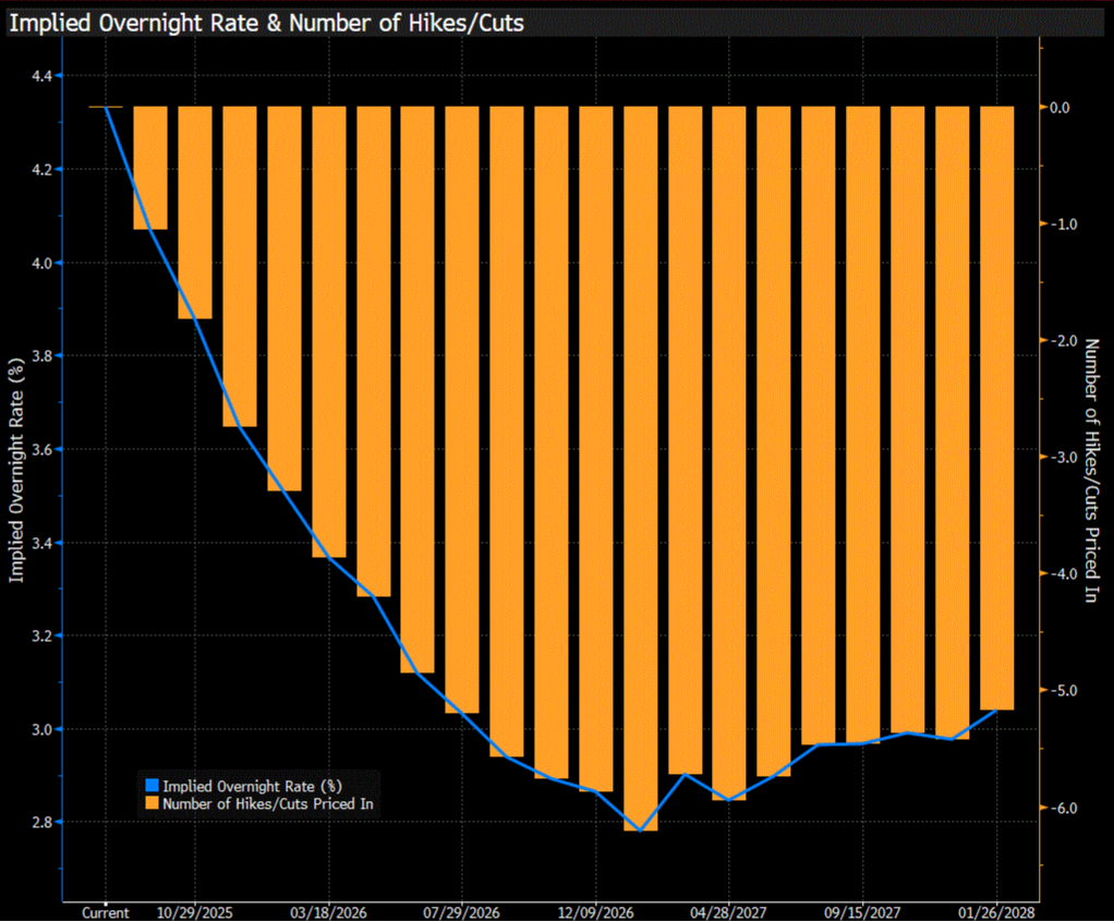3,65% na koniec 2025: na koniec 2025 r. inwestorzy zakładają implikowaną stopę referencyjną na 3,65% i 2,87% na koniec 2026 r.