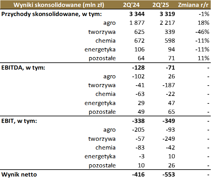 Według wstępnych szacunków w 2Q’25 Grupa Azoty osiągnęła 3 319 mln zł skonsolidowanych przychodów ze sprzedaży, 71 mln zł straty EBITDA i 553 mln zł straty netto.