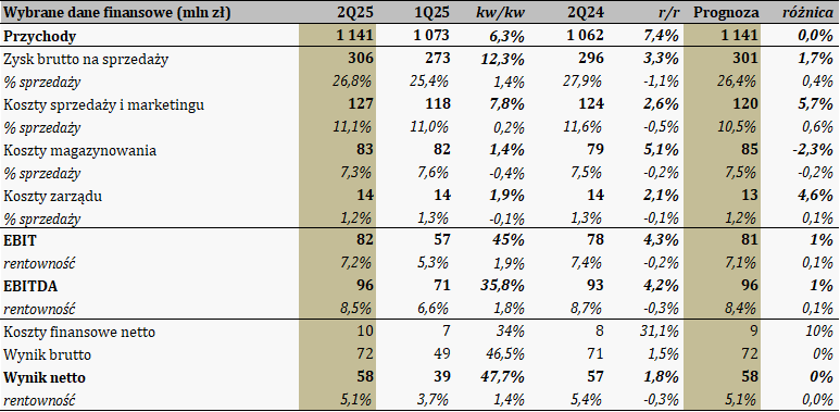 W najważniejszych kategoriach wynikowych dane niemalże w punkt naszej prognozy. Odchylenia na EBIT czy zysku netto sięgają maksymalnie 1%, zatem 2Q25 przebiegł zgodnie z naszymi założeniami.