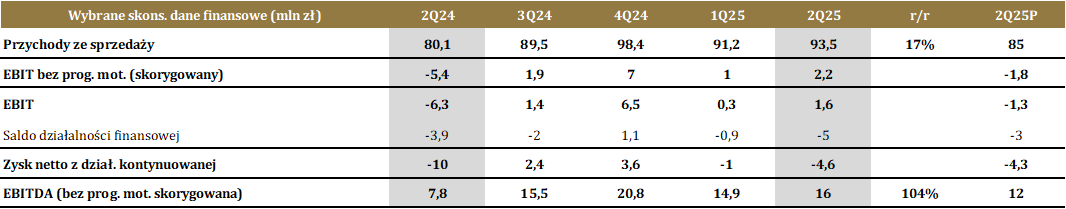 Przychody w 2Q25 wyniosły 93,5 mln zł (vs 85 mln zł nasza prognoza), EBITDA bez programu motywacyjnego 16 mln zł (vs 12 mln zł nasza prognoza), wynik netto -4,6 mln zł (vs -4,3 mln zł nasza prognoza),