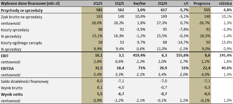 Koniec końców EBITDA osiągnęła 31,5 mln zł wobec prognozowanych 22,4 mln zł, więc mówimy o wyraźnym pozytywnym zaskoczeniu. Pod względem marży (5,4%) był to najlepszy 2Q od 2021 r. (pamiętajmy o wyraźnej sezonowości wyników).