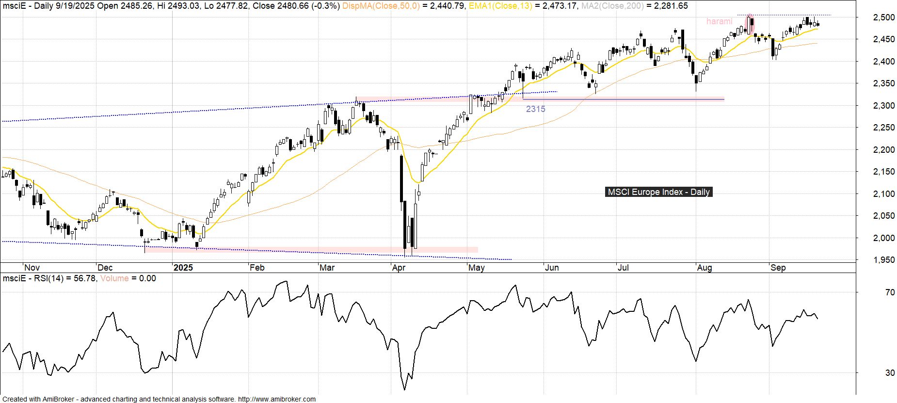 W przypadku skupiającego 15 europejskich rynków rozwiniętych indeksu MSCI Europe wyznaczenie nowego rekordu wszechczasów po ostrej przecenie z pierwszej połowy kwietnia okazało się kwestią niespełna miesiąca, co wypada uznać za duże pozytywne zaskoczenie, z którym wiąże się sygnał wejścia w nową falę hossy po blisko rocznej rozszerzającej się konsolidacji. W tej perspektywie główną linią obrony pozostaje pułap 2 315 pkt, natomiast na krótką metę mamy do czynienia z zatrzymaniem pod sierpniowym szczytem 2 504 pkt, co wobec relatywnej słabości rynku europejskiego może sprowokować korektę w kierunku minimów z początku września.