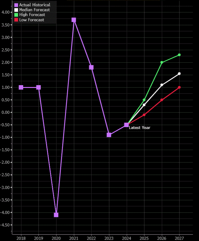 Konsensus rynkowy zakłada przyspieszenie dynamiki PKB Niemiec do 2027 r. do 1,0% (negatywny scenariusz), 1,6% (mediana oczekiwań) do 2,3% (pozytywny scenariusz).
