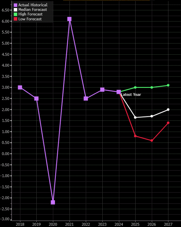 Konsensus rynkowy zakłada przyspieszenie dynamiki PKB USA do 2027 r. do 1,4% (negatywny scenariusz), 2,0% (mediana oczekiwań) do 3,1% (pozytywny scenariusz),