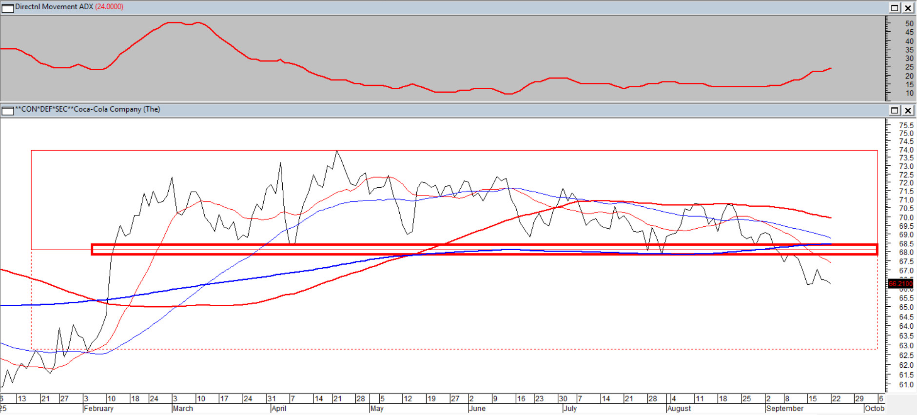 Niegdyś akcje tego producenta stanowiły procentowo w portfelu Warrena Buffetta znacznie większy udział niż obecne 9-11%. Wyrocznia z Omaha nie jest chyba z zachowania tego waloru i sposobu poruszania w pełni zadowolony. Kurs po wielomiesięcznej konsolidacji wybił się we wrześniu z niej dołem. To tradycyjnie oznacza zwiększone prawdopodobieństwo kierowania się o wysokość wspomniane figury, a zatem co najmniej w okolice 63$. Obecny trend jest potwierdzony niedźwiedzim ułożeniem średnich 15/45/100/200 i trendowym wzrostem wskaźnika ADX(14).