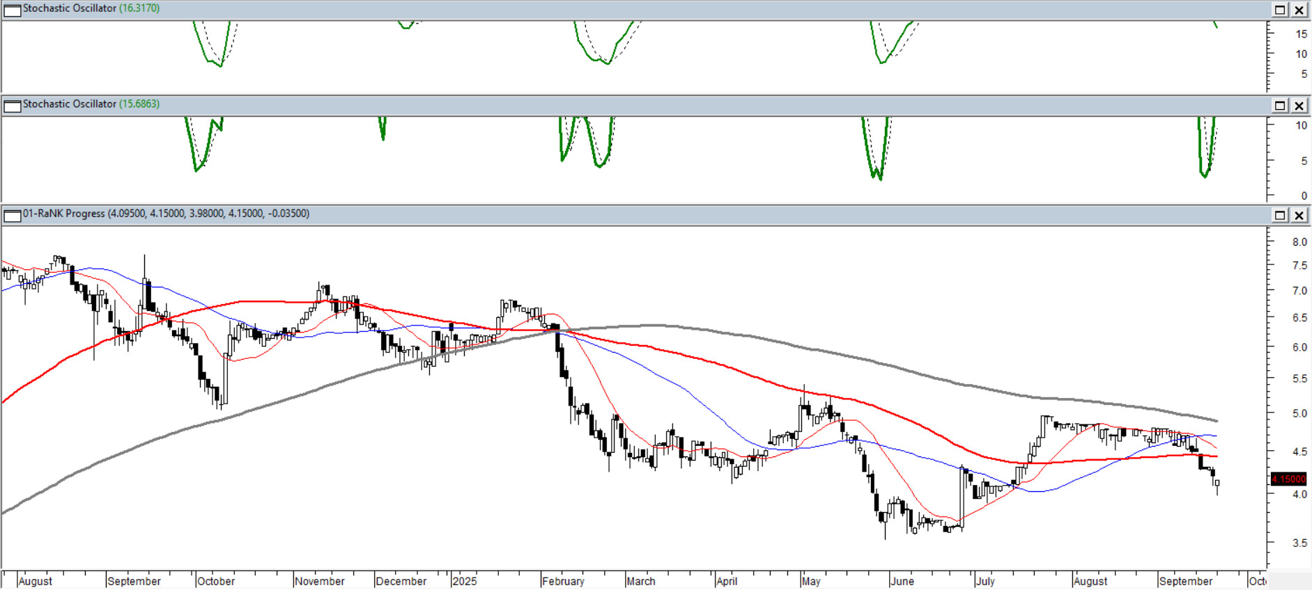 Wakacyjna konsolidacja jaka miała miejsce w sierpniu zakończyła się wybiciem kursu w dół, w efekcie kurs znalazł się poniżej sekwencji średnich 15/45/100/200, choć ponad średnią z 200 sesji ostatnim razem był na początku roku. Taka sytuacja może nadal zniechęcać trendowych inwestorów szukających ciekawego tematu, ale zachęcać krótkoterminowych poszukiwaczy niskich cen. Oscylatory szybkie osiągają poziom, gdzie ruch w przeciwną stronę niż trendowy zapewne nikogo nie zdziwi.