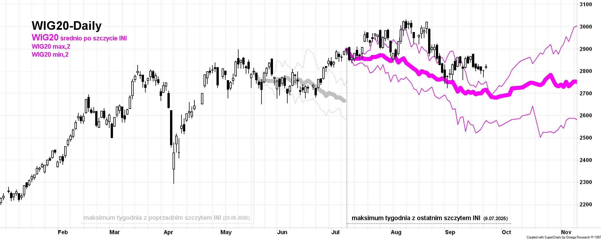 Ostatnie wyniki prowadzonego przez SII cotygodniowego badania sentymentu krajowych inwestorów indywidualnych pokazały wzrost odsetka byczych oczekiwań z 41.2% do 53.0% oraz spadek odsetka oczekiwań niedźwiedzich z 33.8% do 25.8%. W rezultacie saldo byków i niedźwiedzi (INI) podniosło się z 7.4% do 27.2%, co sądząc po zachowaniu WIG20 na ostatnich sesjach wydaje się poprawą mocno na wyrost i stąd raczej nietrwałą. Z drugiej strony od ostatniej kulminacji sentymentu (odczyt 44.8% z początku lipca) minęło 2.5 miesiąca, a jest to czas - o czym więcej w dalszej części komentarza - kiedy próby odbudowy nastrojów są już dopuszczalne. Przypominając zaś ogólną tendencję, szczyty wskaźnika INI budowane na pułapie przekraczającym 40% (przy 20-tyg. średniej >20%) w większości historycznych przypadków poprzedzały niekorzystne zmiany na rynku akcji (fioletowe strzałki na wykresie powyżej), z tym że poza najczęstszą możliwością średnioterminowego zwrotu w dół, raz pojawił się także wariant wyhamowania wysokiego tempa zwyżek (rok 2017). Po zsynchronizowaniu i uśrednieniu wszystkich ośmiu historycznych ścieżek zachowania WIG20 po szczycie INI otrzymujemy projekcję (pogrubiona linia fioletowa na wykresie poniżej), która od początku sierpnia opada przez kolejne półtora miesiąca. Dołączono także ścieżki maksymalną i minimalną (w ujęciu drugich wartości skrajnych), które we wspomnianej wcześniej perspektywie potwierdzają kierunek głównej projekcji. Później natomiast rozpiętość między ścieżką maksymalną i minimalną zaczyna się wyraźnie powiększać sugerując, iż wpływ kontrariańskiej wymowy sentymentu bazującego na wskaźniku INI wraz z upływem niespełna trzech miesięcy po ostatnim szczycie przestaje odgrywać istotne znaczenie.