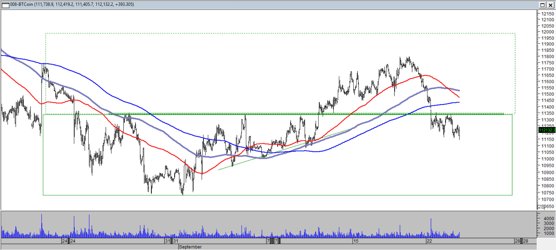 Konsolidacja mająca swój początek w III dekadzie sierpnia przyjęła postać formacji ‘Spodka” (choć niektórzy mogą dostrzec tu RGR). Po wybiciu z kształtowanej figury górą (10 IX) należało oczekiwać ruchu w górę standardowo co najmniej o wysokość tejże konsolidacji, tj w rejon 120.000 $ Tak się jednak nie stało, w efekcie kurs zawrócił poniżej linii szyi kształtowanej formacji. To może sprzyjać dalszemu osłabieniu kursu i sugerować kontynuację ruchu spadkowego. Średnie 100/200/300 ułożone są w sposób typowy dla rozpoczynającego się ruchu spadkowego.
