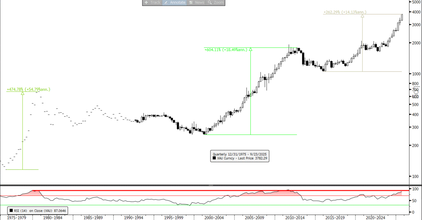 Aktualna euforia na notowaniach złota, przypomina gorączkę złota z lat ’70 XX w., gdy notowania złota od września ’76 do września ’80 wzrosły o 4,7 razy, choć skala wzrostu to też efekt niskiej bazy,