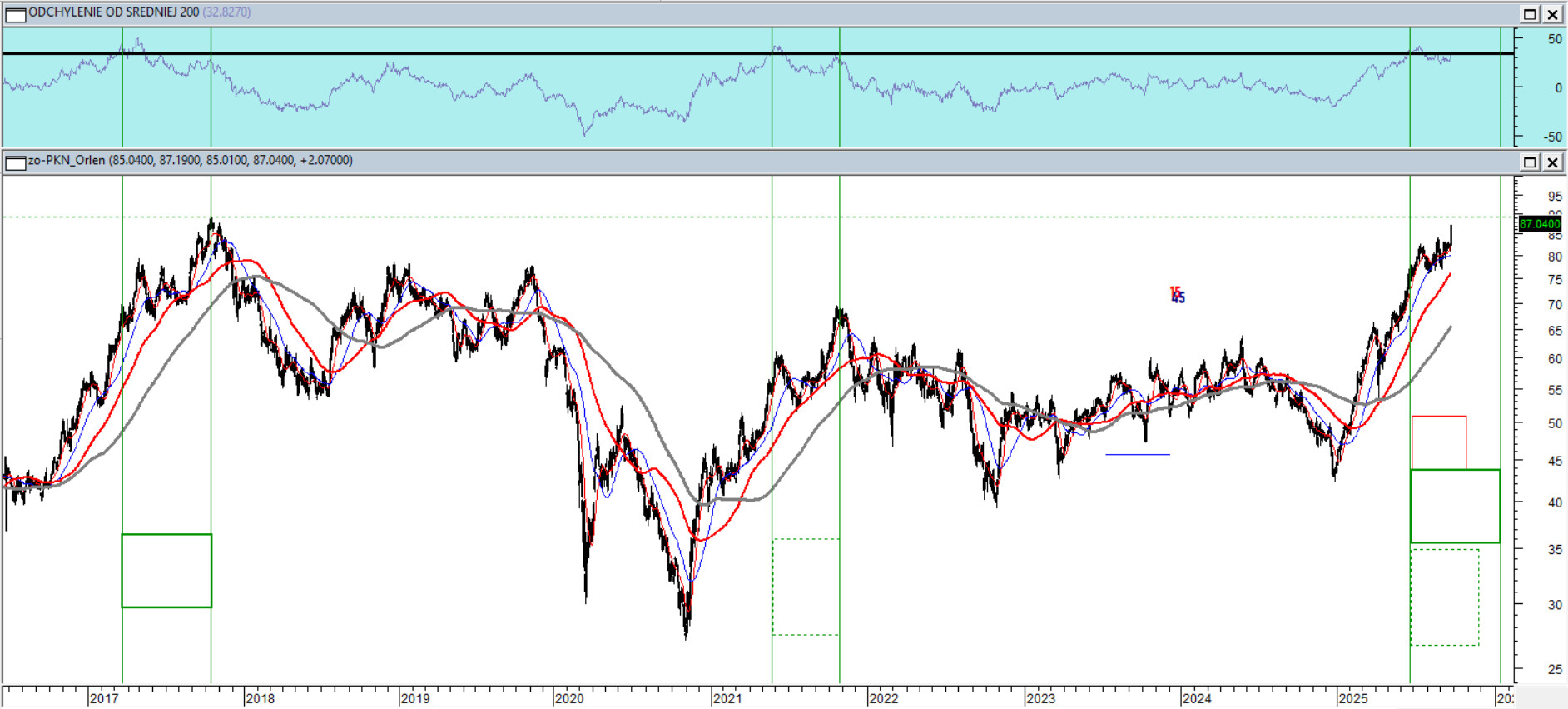 W ostatnim okresie spośród spółek z indeksu Wig20 kurs Orlenu można pod kątem siły relatywnej uznać za jednego z liderów. Na horyzoncie widać w oddali poniżej 90 zł szczyt historyczny z 2017 roku. W ostatnich tygodniach miało miejsce (ponownie) dość silne odchylenie kursu tego waloru od średniej z 200 sesji powyżej 35%. Historia notowań ostatnich 10 lat pokazuje, że tak duże odchylenie nie kończy jeszcze długoterminowego trendu, a szczyt orlenowskiej koniunktury (na podstawie zachowania poprzednich 3 przypadków) można ulokować gdzieś pomiędzy 30 X a 15 stycznia przyszłego roku.