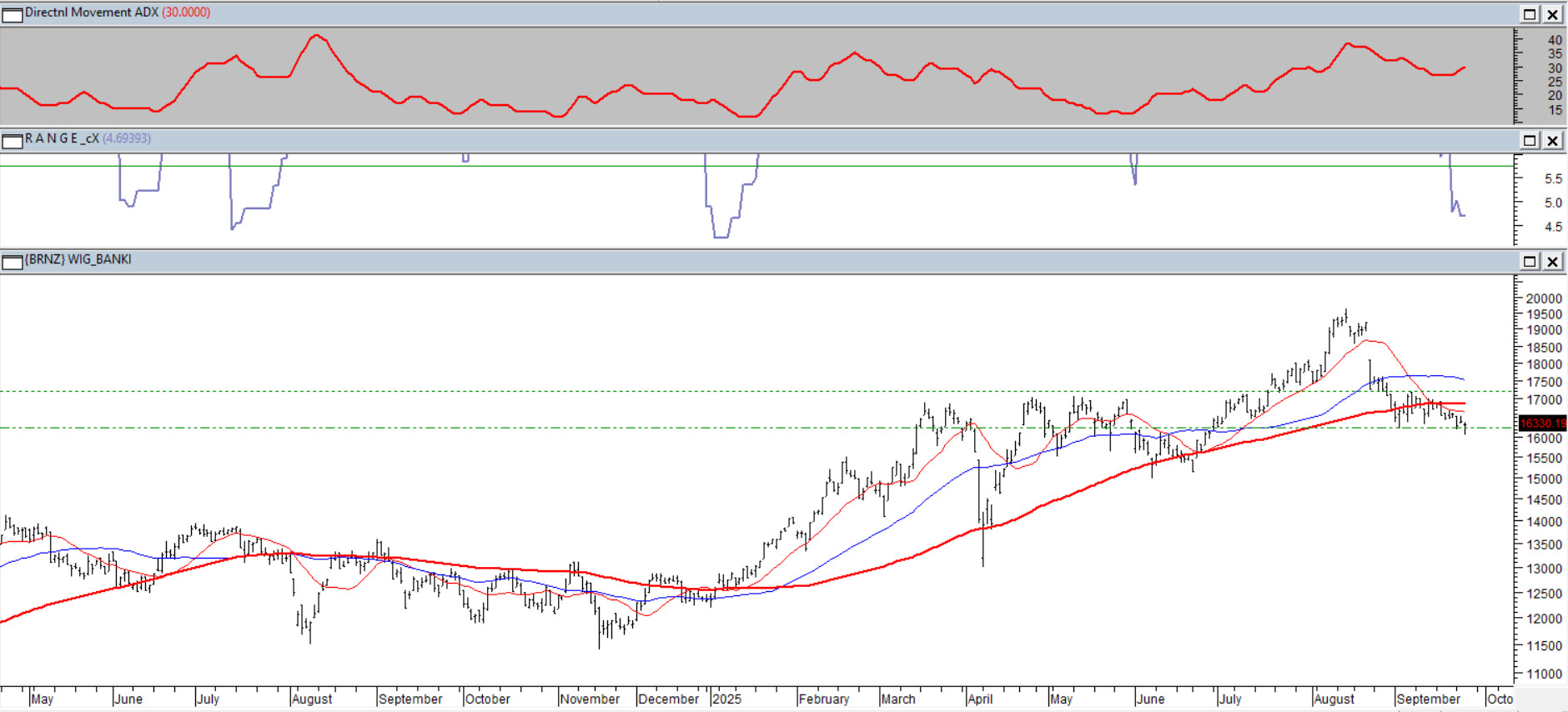 Podczas środowej sesji indeks banków w czasie jej trwania obniżył się do poziomów z początku wakacji. W ten sposób doszło do delikatnego wybicia dołem z małej, wrześniowej konsolidacji. Ciekawe, że pasmo zmian z tego okresu (liczone w cenach zamknięć) spadło do poziomu poniżej 5%., najniższego od początku roku. Poziomu, który w ostatnim czasie poprzedzał deklarację z obu stron. Taka, połączona z wybiciem lokalnych minimów będzie (co najmniej do czasu ruchu ponad wrześniowe maksimum) premiować niedźwiedzie. Średnie 15/45/100 ułożone są oporowo, a kierunkowy ADX(14) od kilku sesji rośnie sugerując utrendowenie w kierunku spadkowym.