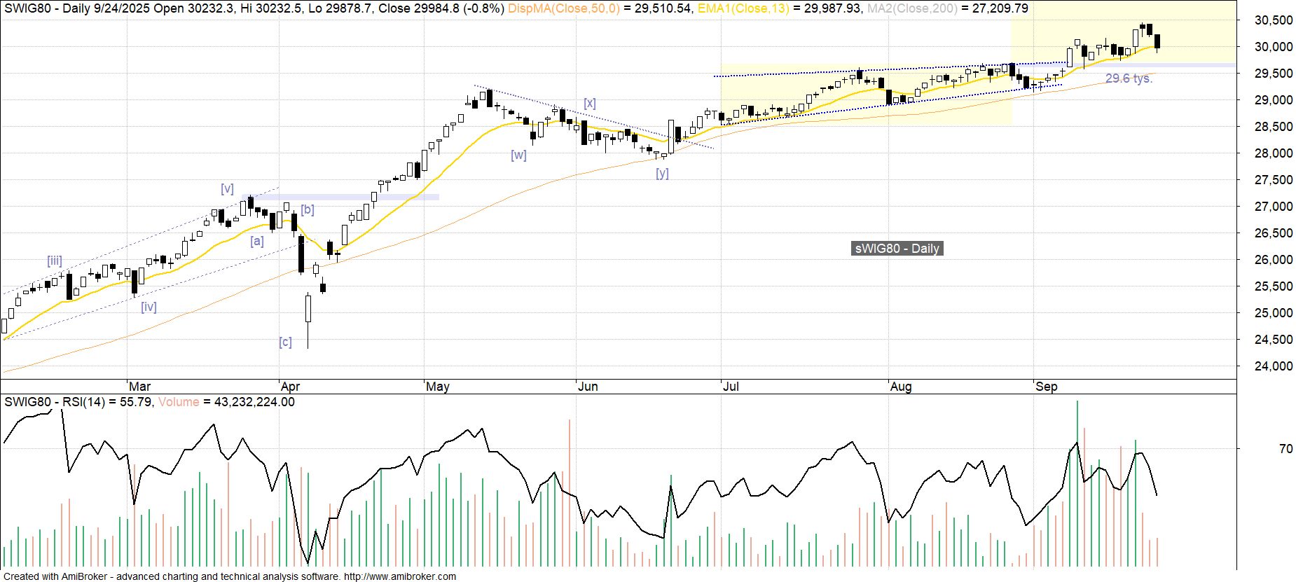 Reprezentowany przez sWIG80 zdecydowanie najmocniejszy od ponad miesiąca segment krajowego rynku akcji w trakcie ostatnich dwóch sesji odnotował wyraźne cofnięcie, wyróżniając się tym samym na niekorzyść nawet na tle mocno ‘dotkniętego’ dywidendą PZU indeksu WIG20. Choć szanse na pełną realizację zasięgu wybicia sugerowanego przez wysokość opuszczonego niedawno górą blisko 3-miesięcznego wznoszącego się klina (30.9 tys. pkt) nadal przeważają, to oczekiwania te będzie należało zmienić już w przypadku spadku poniżej przebiegającej na wysokości wczorajszego zamknięcia średniej EMA(13). Główna linia obrony to zaś 29.6 tys. pkt (górny wierzchołek klina).