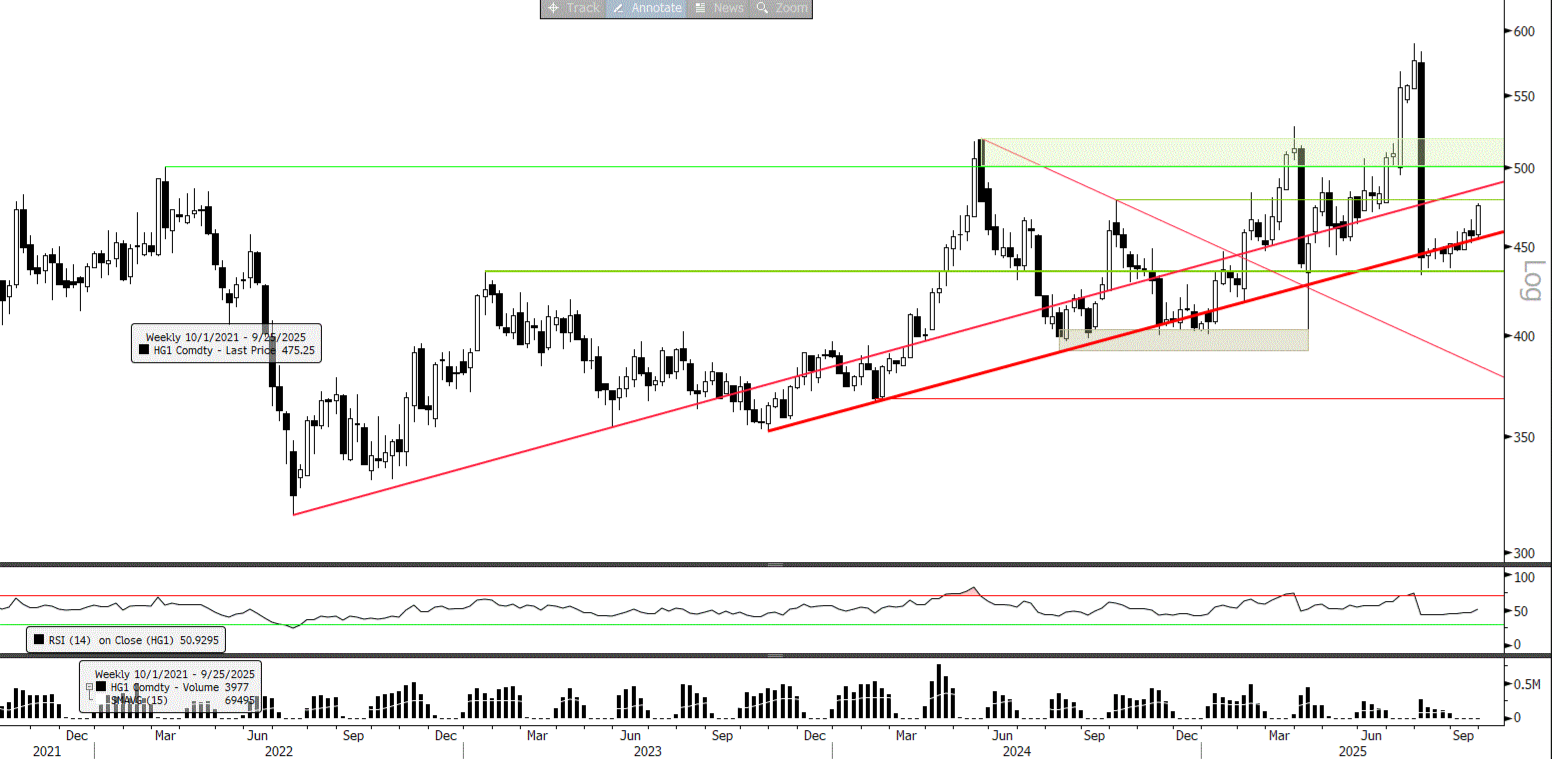 AT tygodniowy: notowania odbijają się od wsparcia na ~351 USD za funt i wyjście ponad opór na (479) umożliwi retest szczytów z 2024/2025 na 500-520.